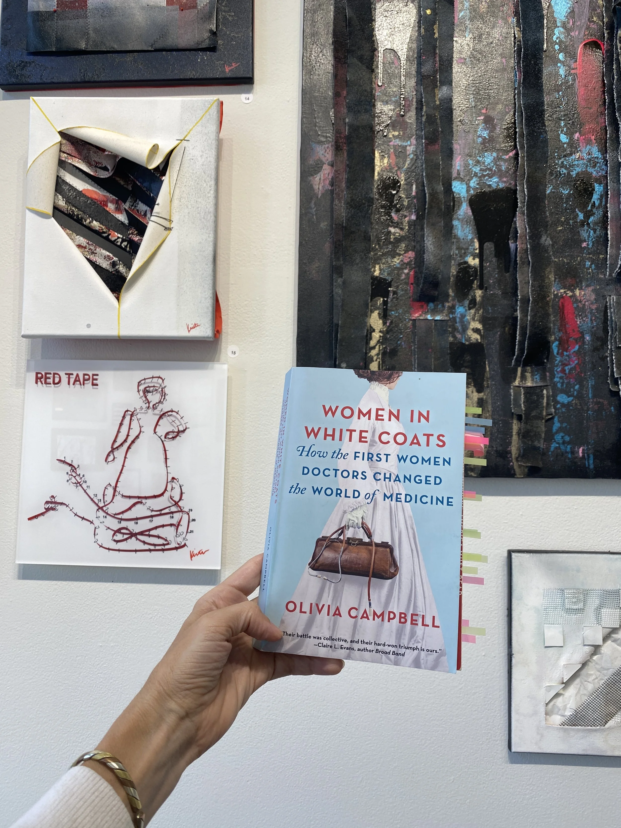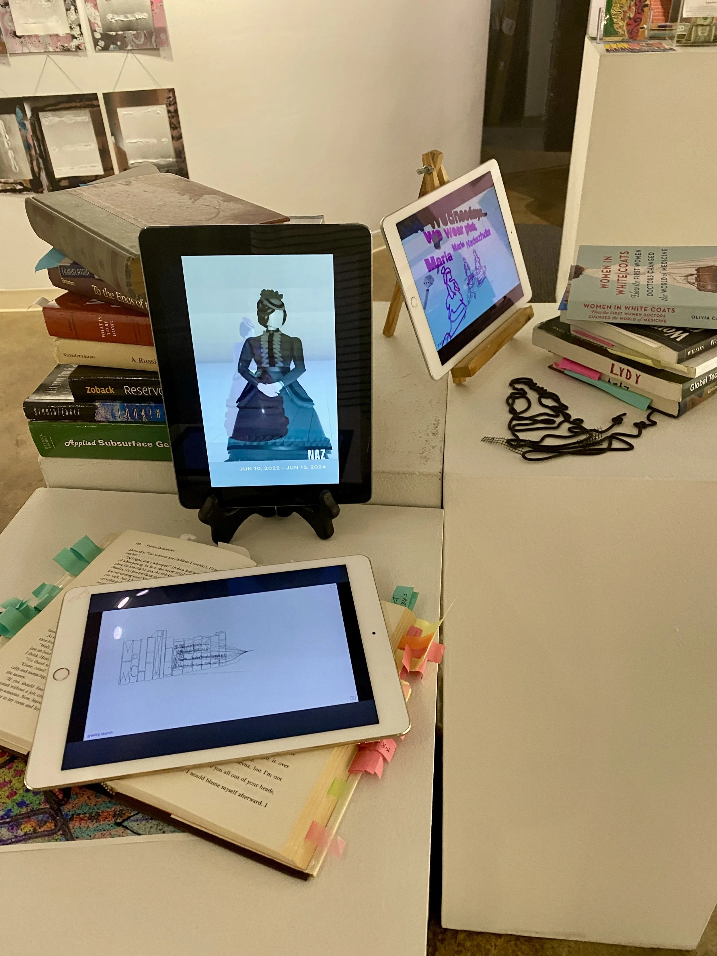 Created in Virtual Reality with digital drawing tools, each of the seven doctors are represented with a continuous string of thread showcasing their individual natures and imperfections. It also reminds us women in the 1860s were physically limited due to their giant tiered and corseted gowns. The single thread art was brought into the real world by 3D printing, acrylic prints and digital photo prints. Examples of pieces combined with sewing and quilting are shown below.